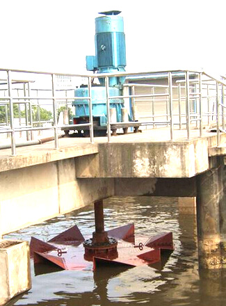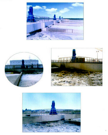 污水在葉輪的旋轉(zhuǎn)推進(jìn)作用下,自葉輪邊緣甩出,形成水幕,裹進(jìn)大量的空氣;葉輪由下向上呈錐型擴(kuò)大,是污水上下循環(huán)流動(dòng),污水充分混合,液面不斷被更新;葉輪底部及背面因水的流動(dòng)形成負(fù)壓,吸入空氣,故污水能與空氣進(jìn)行大面積混合,氧氣迅速溶入污水中,完成對(duì)污水的充氧作用,進(jìn)而待到了凈化效果。同時(shí),強(qiáng)大的動(dòng)力帶動(dòng)了大量水體流動(dòng),從而實(shí)現(xiàn)推流作用。