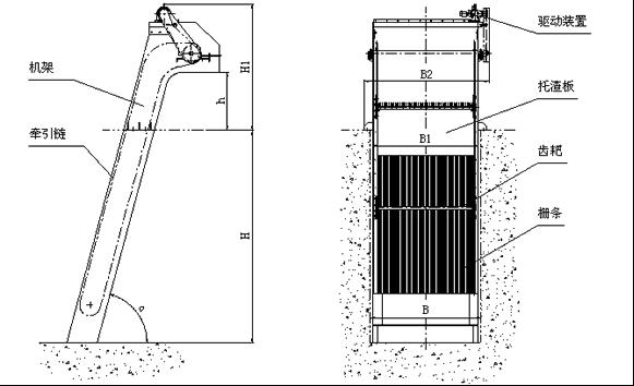 在電動機(jī)的驅(qū)動下,通過減速機(jī)減速后,帶動鏈輪及鏈條運動,固定在回轉(zhuǎn)鏈條上除污齒耙鏈條在柵后運動到底部,經(jīng)過導(dǎo)輪后翻轉(zhuǎn)到柵前迎水面的位置繼續(xù)運動插入固定柵條的間隙中上行,把柵前攔截的污物帶出水面,并隨著鏈條的運動到出渣口處自動翻轉(zhuǎn),污物自卸到格柵后的輸送機(jī)或渣桶中,完成排污過程,液體則通過柵條的柵隙流過,整個工作狀態(tài)連續(xù)循環(huán)進(jìn)行。